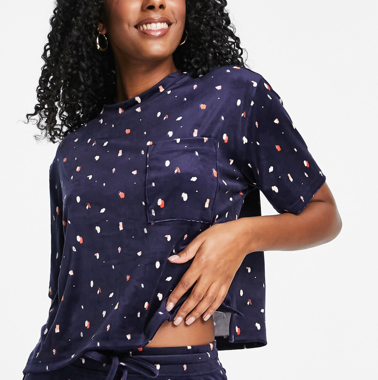 Hunkemoller Dottie short sleeve velour pyjama top in navy spot print