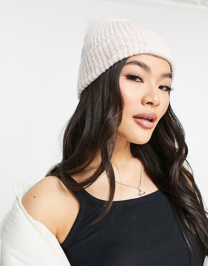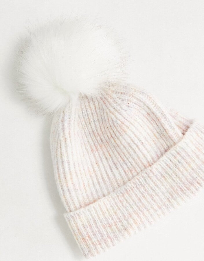 ASOS DESIGN multi knit rib beanie with cream faux fur pom