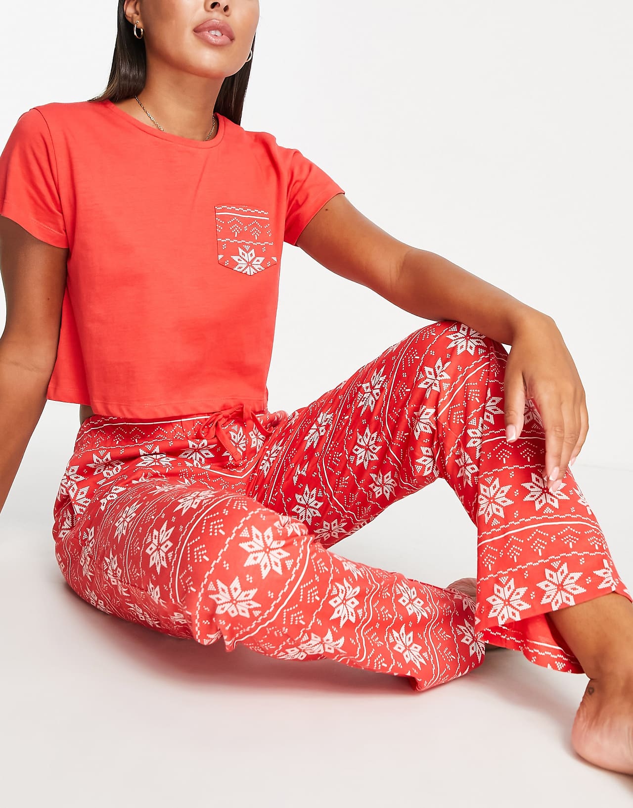 Brave Soul Christmas Fairisle Snowflake Pyjama Set in Red